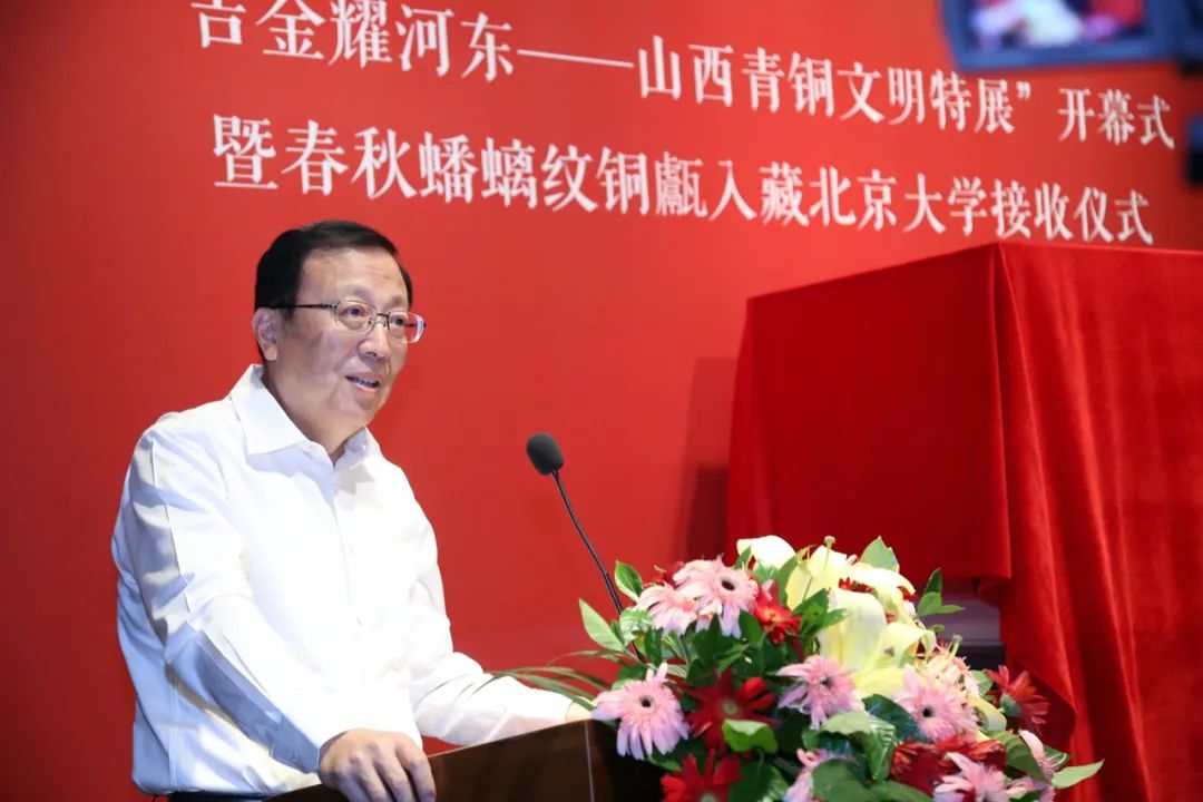 郝平指出,此次特展汇聚了百余件组商周时期的青铜器,从最早的二里头文化青铜酒器到精巧绝伦的战国礼器,不仅具有极高的工艺和美术价值,更引发我们对于从波澜壮阔的历史变迁中继承弘扬中华优秀传统文化的深层思考。他表示,北京大学和山西在考古领域的合作源远流长,自1950年北大学者第一次踏入山西开展文物考古工作以来,从田野考古到古建勘察、文物保护、科技考古和文化遗产研究等,双方的考古合作不断丰富拓展。近年来,山西省考古事业蓬勃发展,发掘工作硕果累累,其中也有北大师生的广泛参与,一些重要成果也体现在本次展览中。郝平相信,北大师生在参观展览后一定能够切身感受到山西人民对北大师生的深情厚谊,同时对博大精深、灿烂辉煌的中华文明有更加全面而深刻的了解。