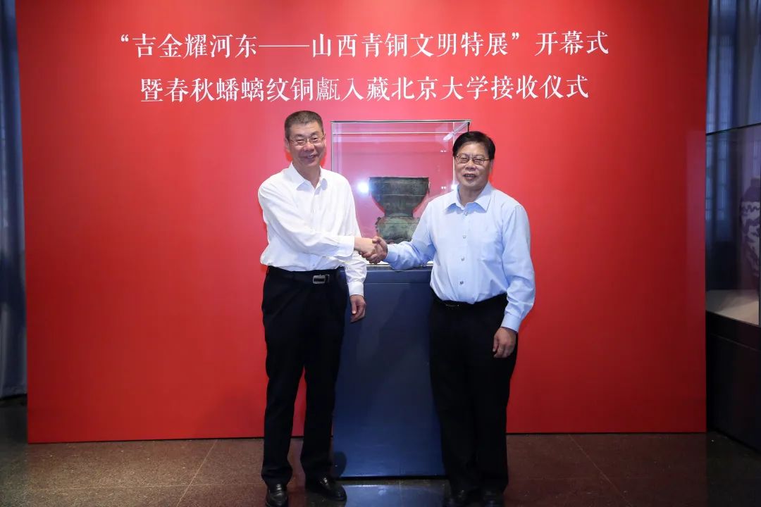 邱水平、张复明共同为春秋蟠螭纹铜甗揭幕。春秋蟠螭纹铜甗是国家二级文物,经国家文物局特别批准,由山西省调拨北京大学入藏,将成为北京大学考古学科珍贵教学标本与赛克勒考古与艺术博物馆的重要馆藏。该文物纹饰细腻、工艺精细,具有典型的晋式青铜器风格,对于推动学科建设与人才培养、开展中华优秀传统文化教育具有重要意义。