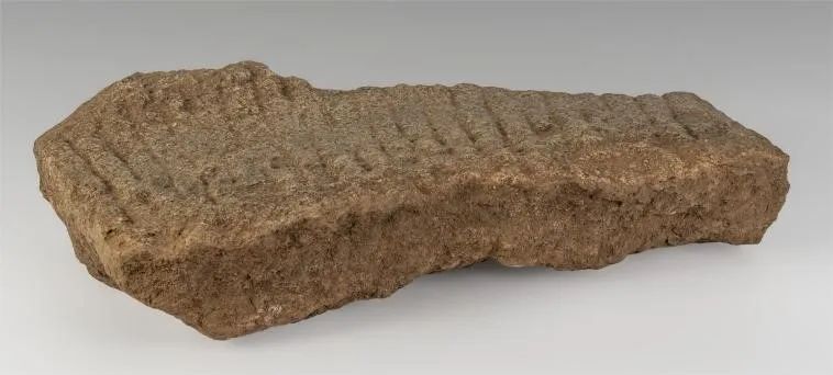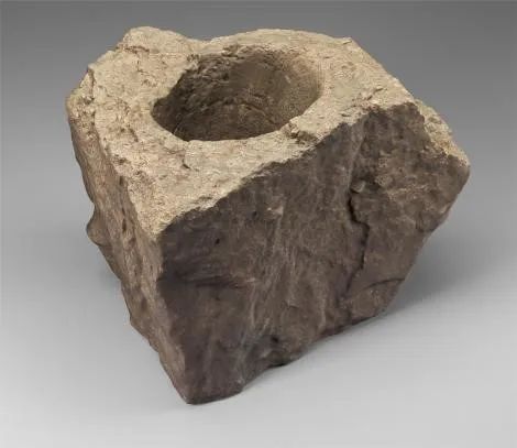 本次发掘出土的石杵、石臼和石碾较有特点,以往未见。石杵为圆柱形,直径16厘米,高13厘米,平顶,中心有圆孔,孔径3.5厘米,周身经磨制,表面光滑,头端圆钝。石臼系在三棱柱体石块的台面中心,加工修理处出深圆凹窝,以承石杵。臼体的三条棱分别长60、50、48厘米,高42厘米。凹窝直径28厘米,深20厘米。石臼凹窝的直径和深度均大于石杵,二者应为配套使用,可能用于食物加工。石碾呈长方形,长44厘米,最宽处25厘米,厚9厘米,表面布满平行凹槽,形似现代“搓衣板”,可能用于研磨粮食或脱壳等与食物加工有关的劳作(图二)。