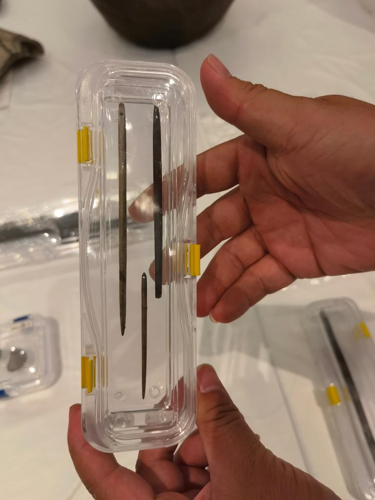 考古专家在展示草堰港遗址出土的骨针。新华社记者邱冰清 摄