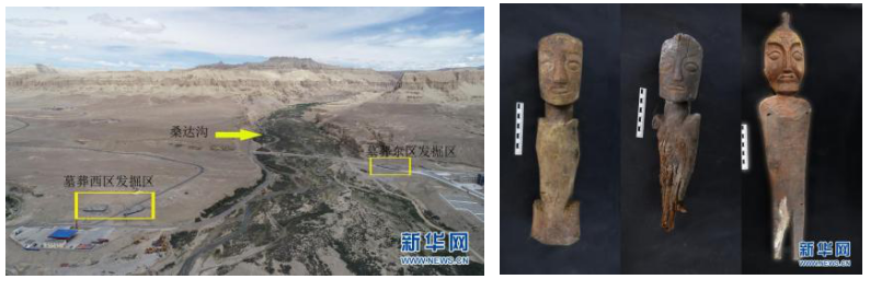 桑达隆果墓地位于阿里地区札达县,桑达隆果即藏语“桑达沟口”。这一墓地墓葬分布密集,出土遗物包括陶器、铜器、扣器、石器、纺织物、料珠、木棺等,其中出土的木俑是青藏高原首次发现,其形制特征与新疆吐鲁番一带墓葬出土的木俑相同。