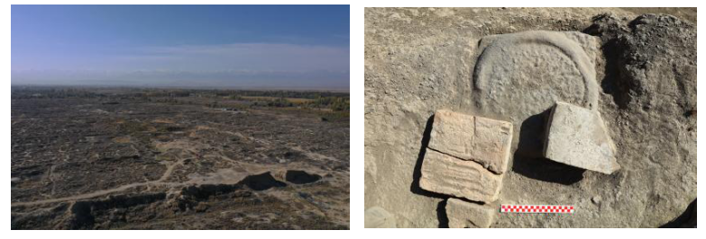 库勒塔佩遗址位于哈萨克斯坦突厥斯坦市市中心,北部为卡拉套山脉,南部为锡尔河,这里是丝绸之路最古老的文化、宗教和商业中心之一,始建年代约为公元前2世纪,其后一直延续使用,在不同时期被称为沙夫加、雅西、突厥斯坦。1964年,哈萨克斯坦考古学家波杜什金教授首次发现该遗址,年代起初定在公元4~14 世纪。2004 年以来,波杜什金教授在库勒塔佩陆续发现15块破碎的粟特文刻铭砖,其年代在公元前2世纪至公元4世纪,也就是我国史书中的康居国时期,林梅村先生认为此地应为《汉书·西域传》所记康居王的夏都“蕃内地”。