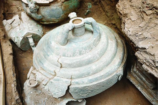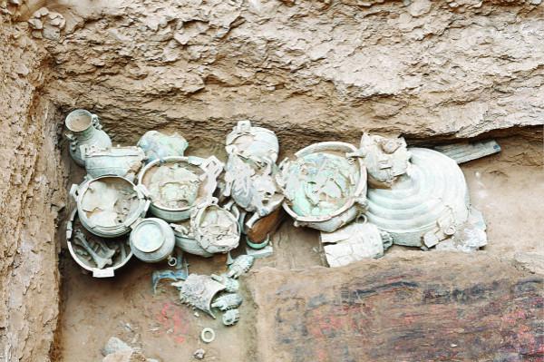 随葬品有铜礼器、乐器、兵器、工具、车马器、玉器、陶器等。铜礼器有鼎13件、夔凤纹圆壶、素面圆壶、簠各2件、方座豆3件、鉴、鬲、盘各1件、铜豆4件;乐器有镈钟13件(靠近盗洞,可能不是完整编钟数量)、甬钟一套13件、鼓座1件、石磬2套10件;铜兵器有戈、戟、箭镞等;铜工具有锛、凿、铜锥、环首刀;车马器有车軎辖、马衔、马镳等,此外还发现有铜合页、铜带扣、贴金铜饰件、海贝、鎏金铜贝、金箔、漆器残迹、铅锡器等,另有陶鬲1件。棺内人骨已腐朽粉末状,棺内发现有残玉片、玉佩饰、玉环、玉韘、玉璜、玉握、踏玉等。