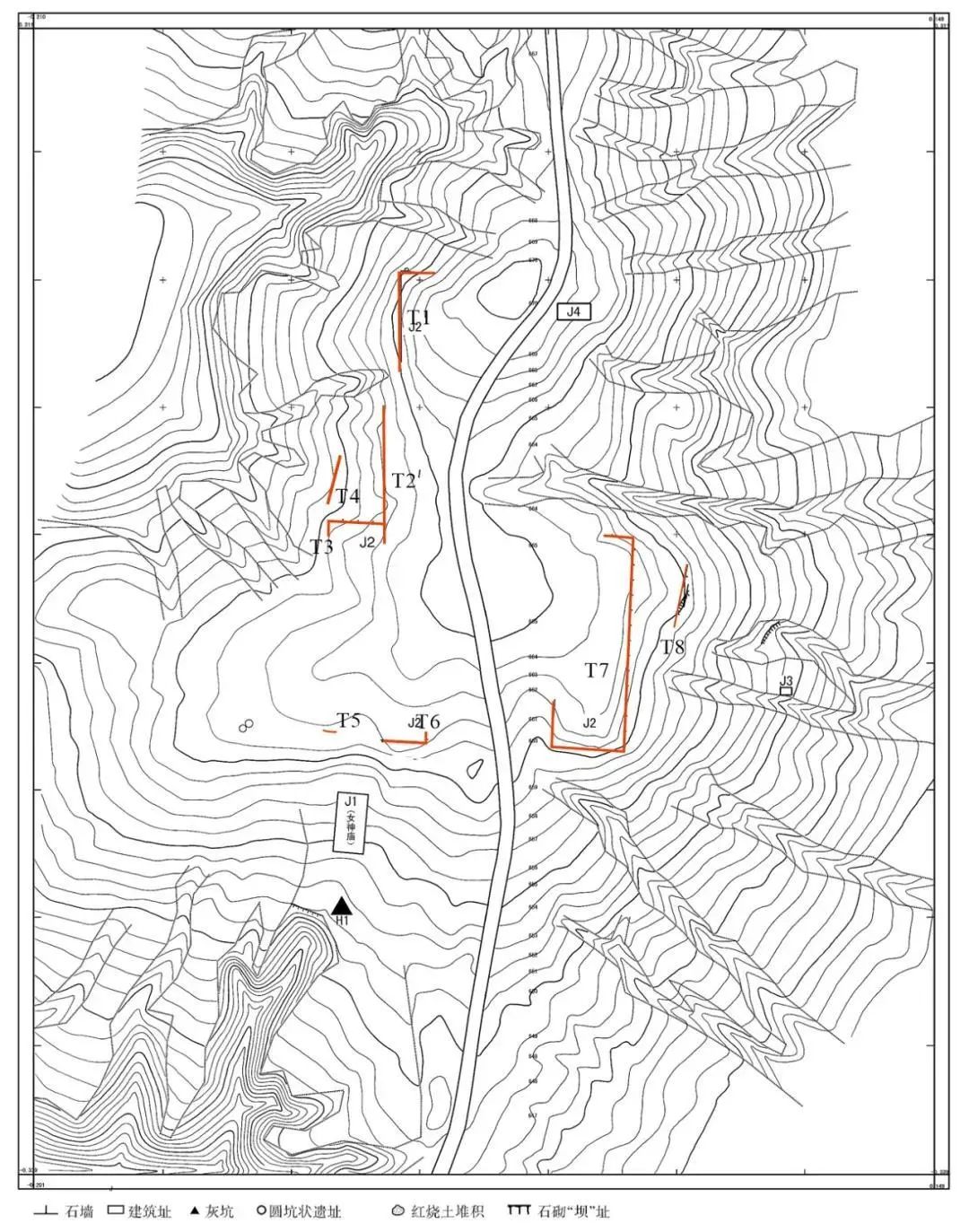 2.虽然由于遗迹被破坏的比较严重,尚无法准确判定T1的南部边界,但初步确认了T1山台的砌筑方式:以地势较高的山脊为中心,在地势较低处对基岩进行简单平整,而后直接砌筑石墙,墙内逐层垫土,最后形成平坦的山台。在山台顶部发现的红烧土面则表明山台上建筑的存在。