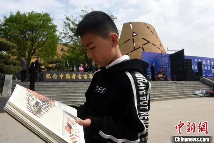 纪念“中国考古百年”系列活动在仰韶遗址举行启动仪式,一位少年在会场认真阅读《仰韶文化》图书。 孙自法 摄