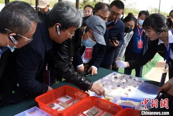 纪念“中国考古百年”系列活动启动仪式后,专家学者代表参观考察仰韶遗址最新发掘出土的遗存遗物。 孙自法 摄